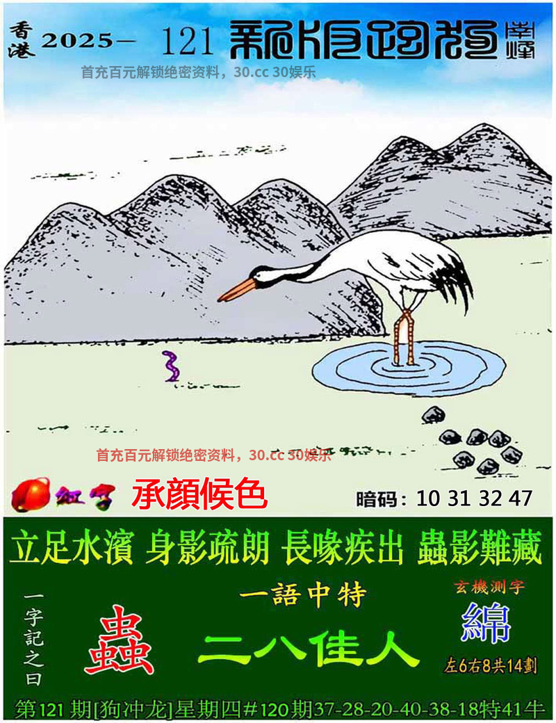 121期一字記之曰:【蟲】立足水濱,身影疏朗,長喙疾出,蟲影難藏《綿》