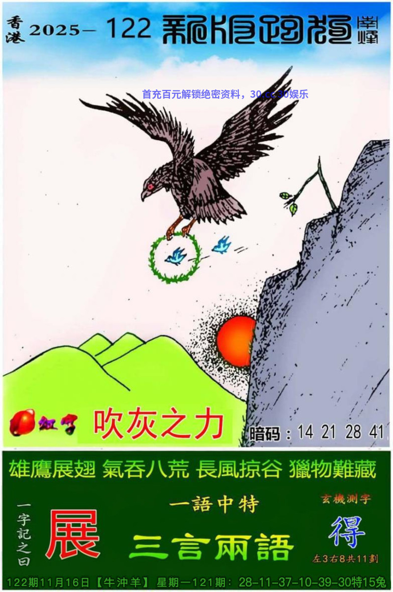 122期一字記之曰:【展】雄鷹展翅,氣吞八荒,長風掠谷,獵物難藏《得》